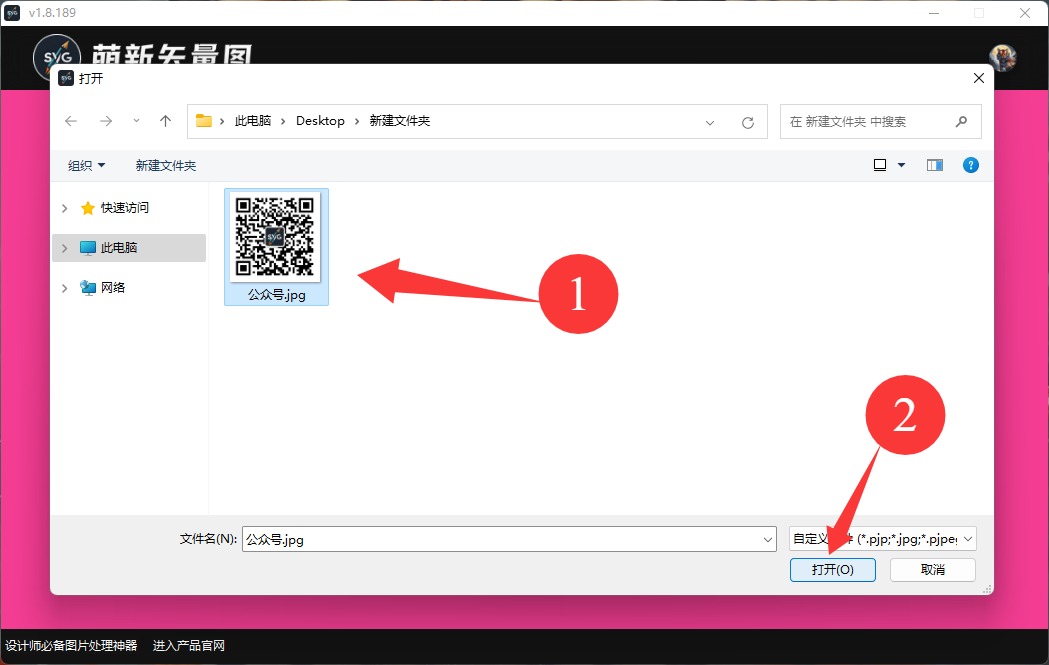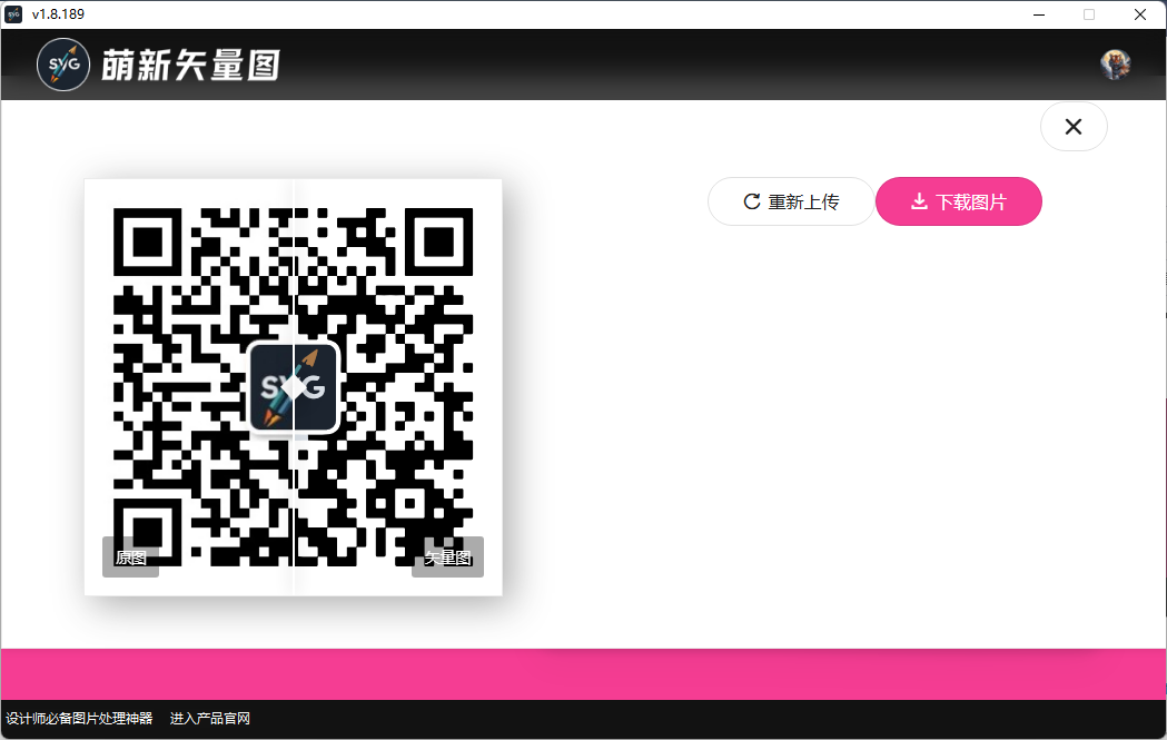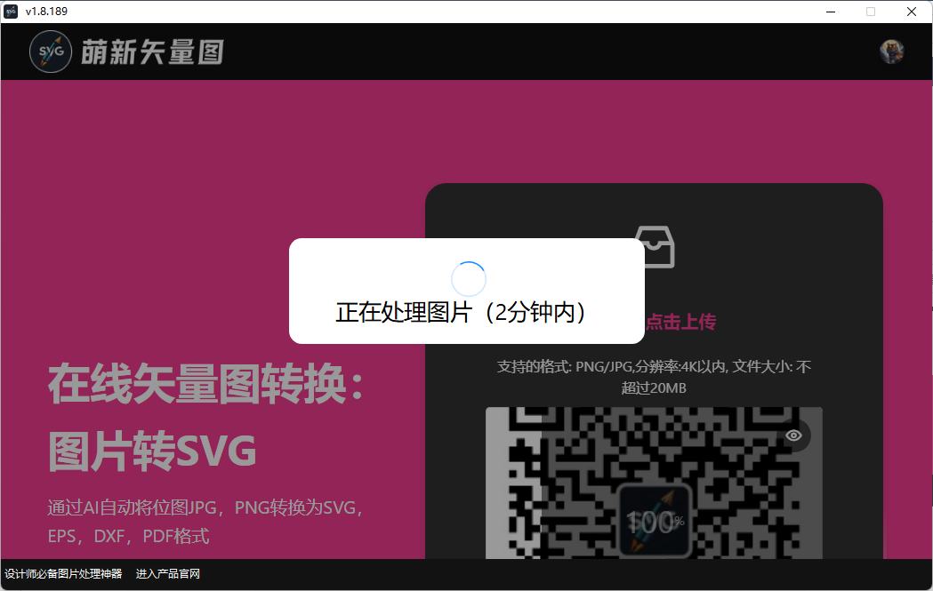 第一步打开萌新矢量图转换器官网首页或者桌面端软件,将准备好的二维码或者小程序码上传到矢量图制作工具中,如下图所示(注意提前选择好输出的格式类型);