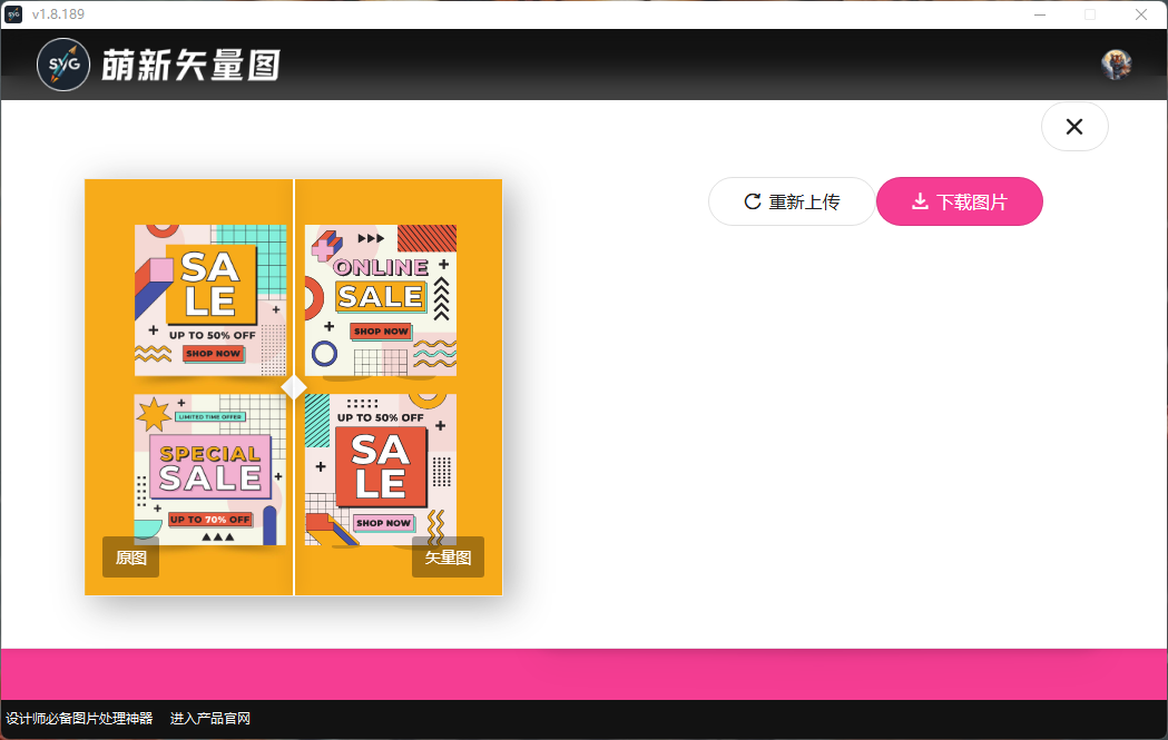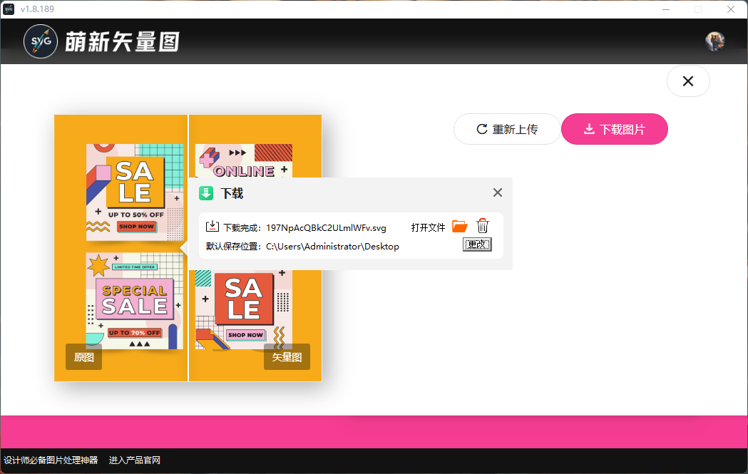 第三步、生成完成后如下图所示可以查看得到原图与转换后的矢量图前后对比预览效果,我们只需要点击右上角的下载按钮将转换好的矢量图文件保存到电脑本地文件夹即可;