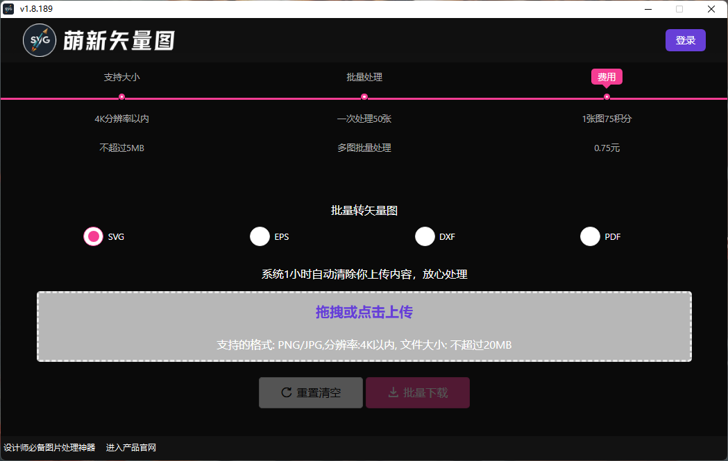 萌新矢量图转换器软件是一款专业的矢量图文件转换生成工具,满足各行业设计、插画以及图纸、印刷等方面使用,支持一键在线将常规的jpg、png图片转换为SVG,EPS,DXF,PDF四种格式,简单易用的操作方式大大降低行业的技术限制要求,任何人都能使用它轻松制作矢量图文件。生成的矢量图文件支持Adobe Illustrator、CorelDRAW、Autodesk AutoCAD等设计软件进行再次编辑修改。